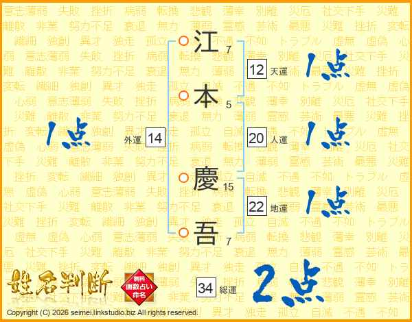 生活面を象徴する運勢です。外部から受ける影響力を表し、結婚運、家庭運や職場、環境への順応性を表します。総運から人運を引いた画数。姓や名が1文字の場合を除く。