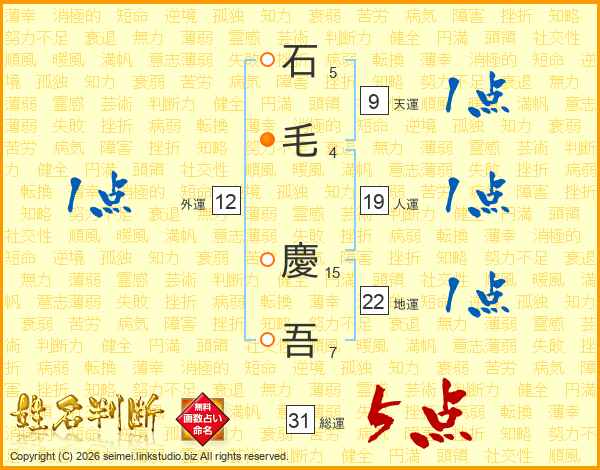 石(5画)毛(4画) 慶(15画)吾(7画)