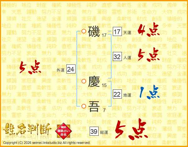 磯慶吾さんの総運は39画の5点!