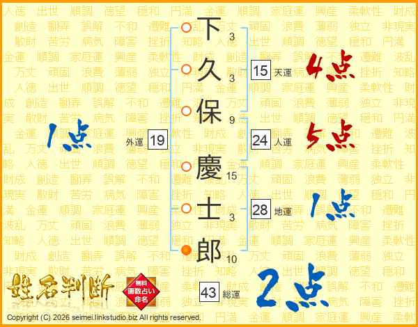 下久保慶士郎さんの総運は43画の2点!