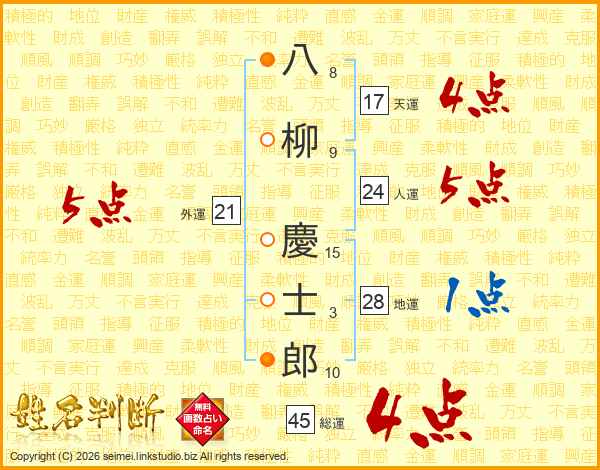 八柳慶士郎さんの総運は45画の4点!