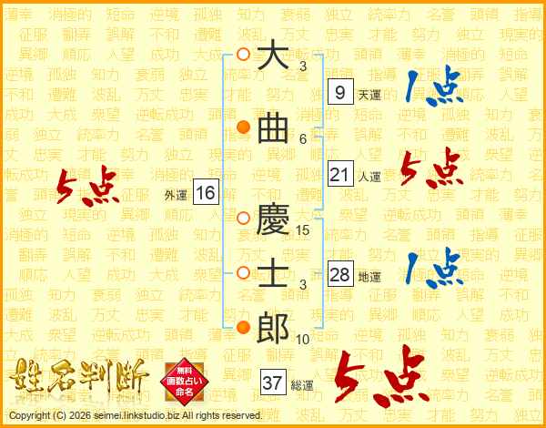 大(3画)曲(6画) 慶(15画)士(3画)郎(10画)