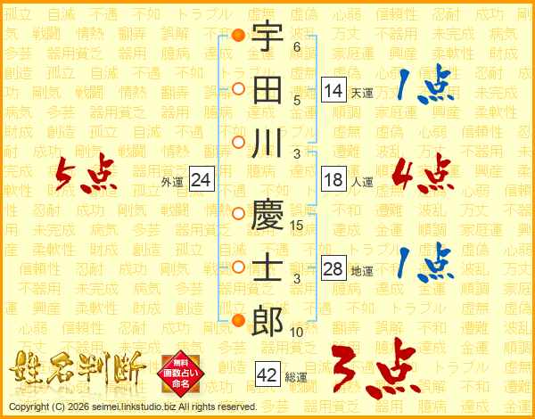 宇(6画)田(5画)川(3画) 慶(15画)士(3画)郎(10画)