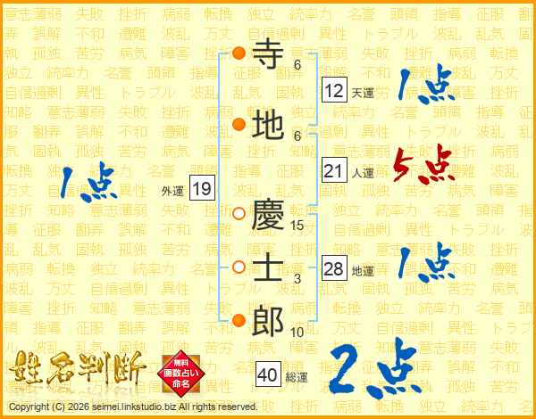 寺(6画)地(6画) 慶(15画)士(3画)郎(10画)