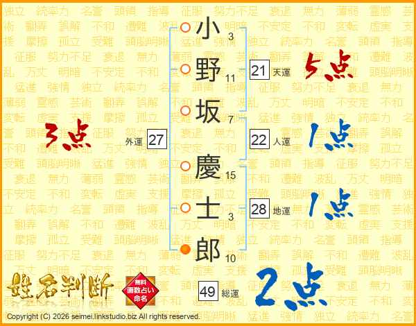 小(3画)野(11画)坂(7画) 慶(15画)士(3画)郎(10画)