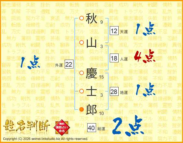 秋(9画)山(3画) 慶(15画)士(3画)郎(10画)