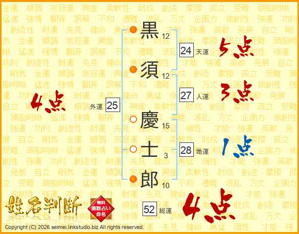黒(12画)須(12画) 慶(15画)士(3画)郎(10画)