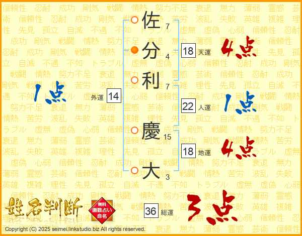 佐(7画)分(4画)利(7画) 慶(15画)大(3画)
