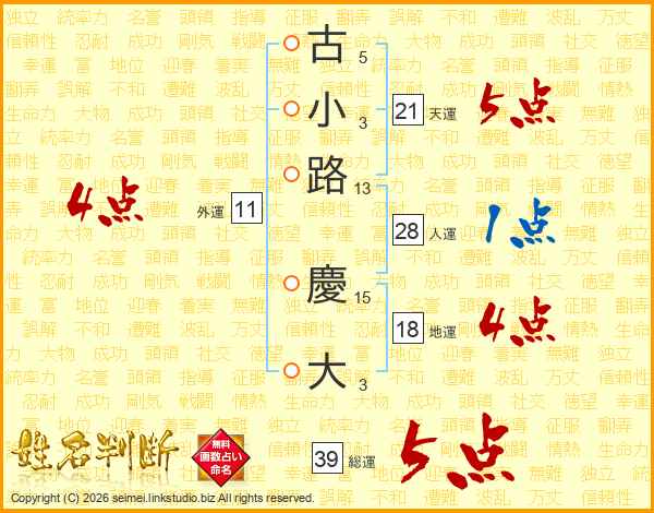古(5画)小(3画)路(13画) 慶(15画)大(3画)
