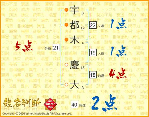 宇(6画)都(12画)木(4画) 慶(15画)大(3画)