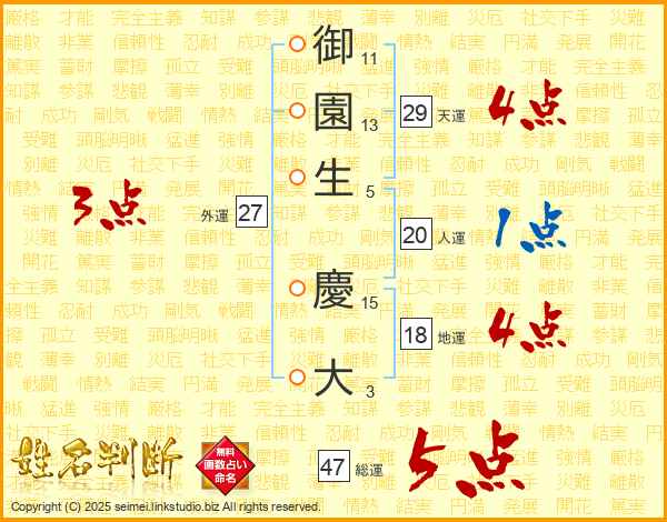 御(11画)園(13画)生(5画) 慶(15画)大(3画)