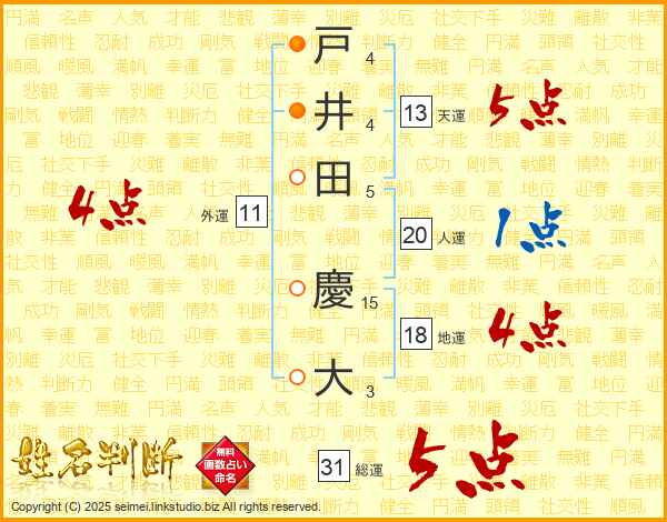 戸(4画)井(4画)田(5画) 慶(15画)大(3画)