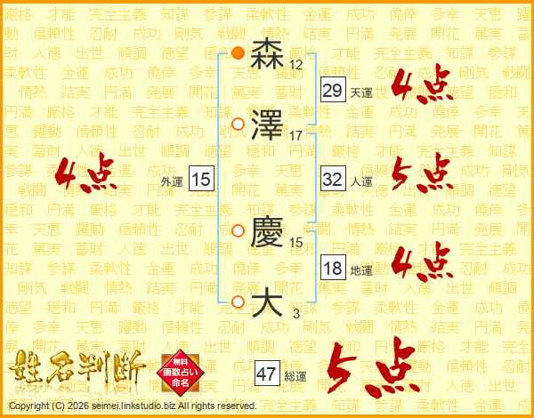 森(12画)澤(17画) 慶(15画)大(3画)