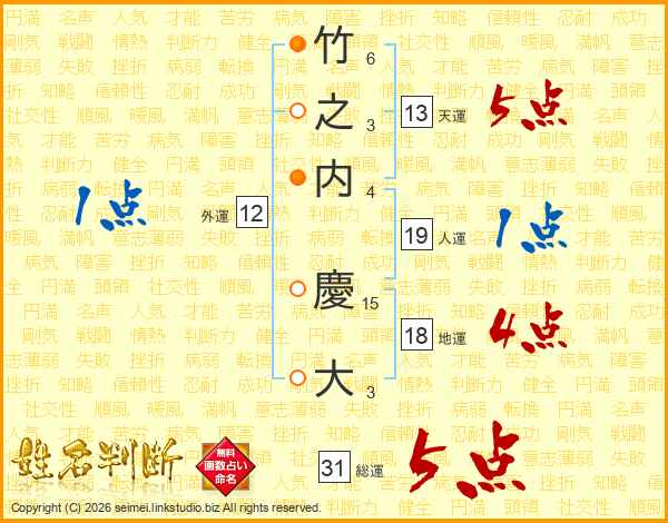 竹之内慶大さんの総運は31画の5点!