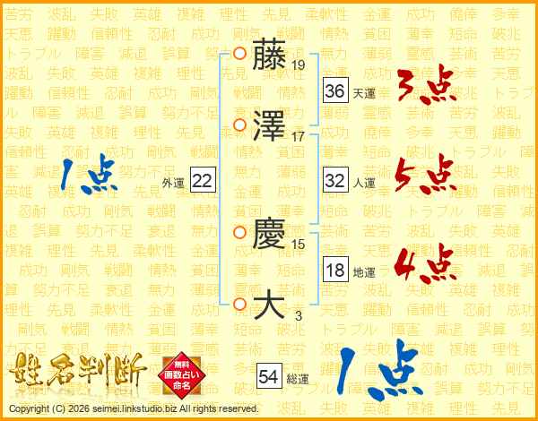 藤(19画)澤(17画) 慶(15画)大(3画)