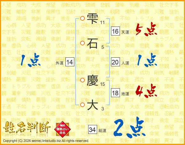 生活面を象徴する運勢です。外部から受ける影響力を表し、結婚運、家庭運や職場、環境への順応性を表します。総運から人運を引いた画数。姓や名が1文字の場合を除く。