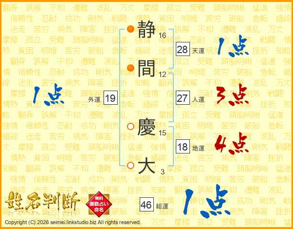 静(16画)間(12画) 慶(15画)大(3画)