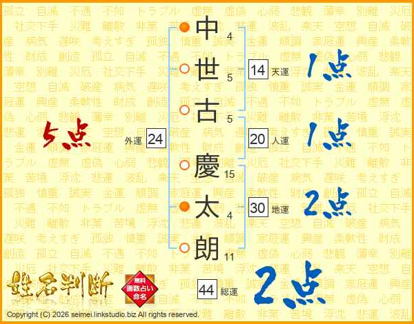中(4画)世(5画)古(5画) 慶(15画)太(4画)朗(11画)