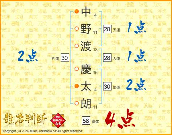 中(4画)野(11画)渡(13画) 慶(15画)太(4画)朗(11画)
