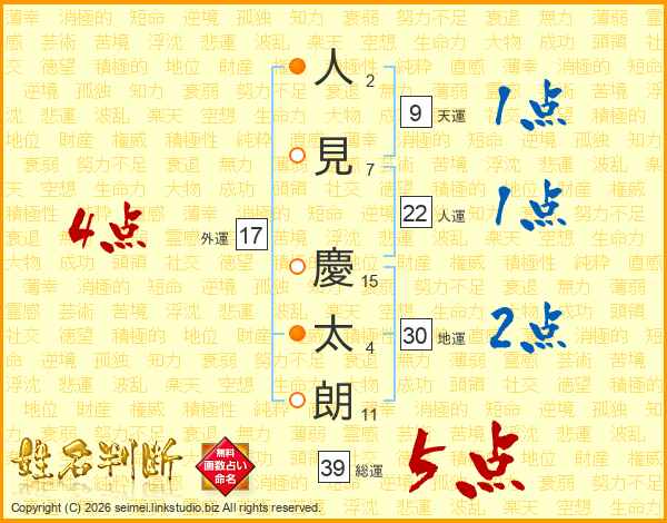 人(2画)見(7画) 慶(15画)太(4画)朗(11画)