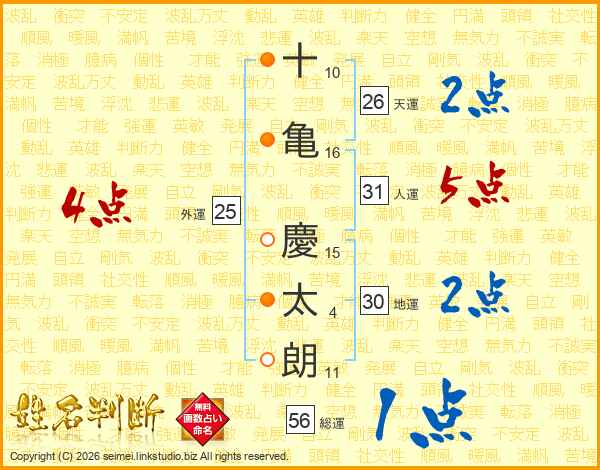 十(10画)亀(16画) 慶(15画)太(4画)朗(11画)