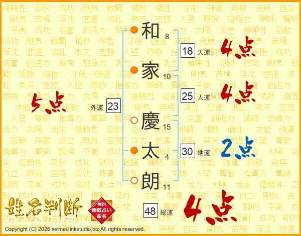 和(8画)家(10画) 慶(15画)太(4画)朗(11画)