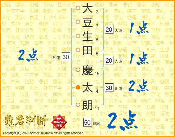 大(3画)豆(7画)生(5画)田(5画) 慶(15画)太(4画)朗(11画)