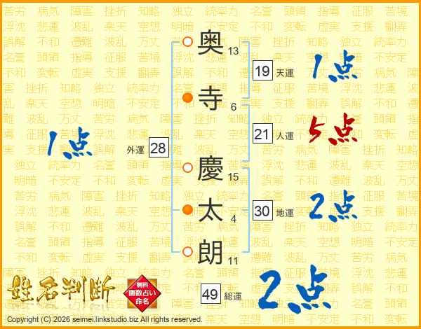 奥(13画)寺(6画) 慶(15画)太(4画)朗(11画)