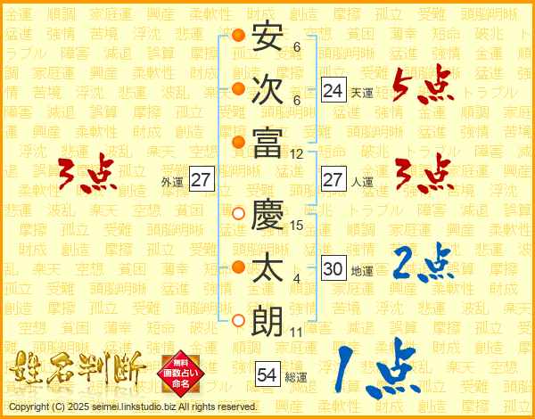 安(6画)次(6画)富(12画) 慶(15画)太(4画)朗(11画)
