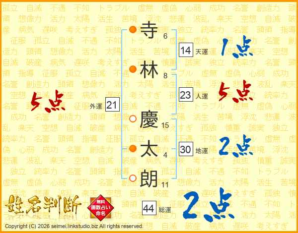 寺(6画)林(8画) 慶(15画)太(4画)朗(11画)