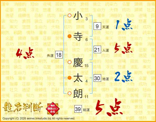小(3画)寺(6画) 慶(15画)太(4画)朗(11画)
