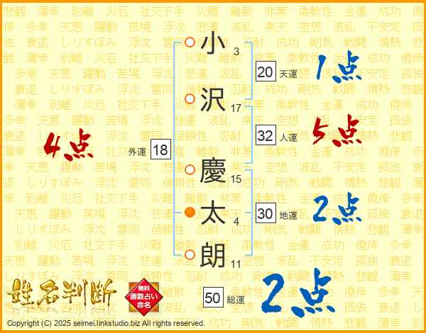 小(3画)沢(17画) 慶(15画)太(4画)朗(11画)