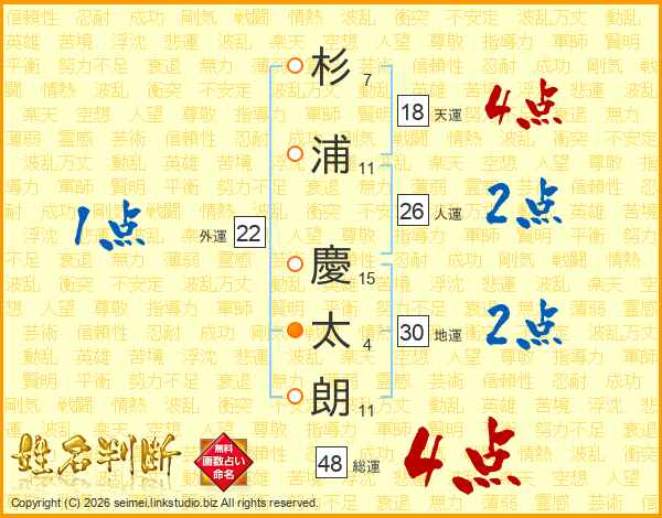 杉(7画)浦(11画) 慶(15画)太(4画)朗(11画)