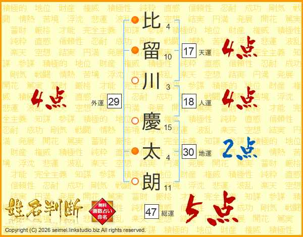 比(4画)留(10画)川(3画) 慶(15画)太(4画)朗(11画)