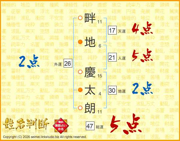畔(11画)地(6画) 慶(15画)太(4画)朗(11画)