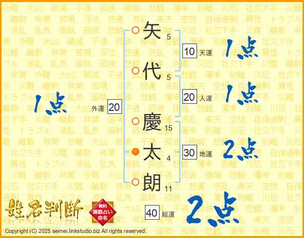 矢(5画)代(5画) 慶(15画)太(4画)朗(11画)
