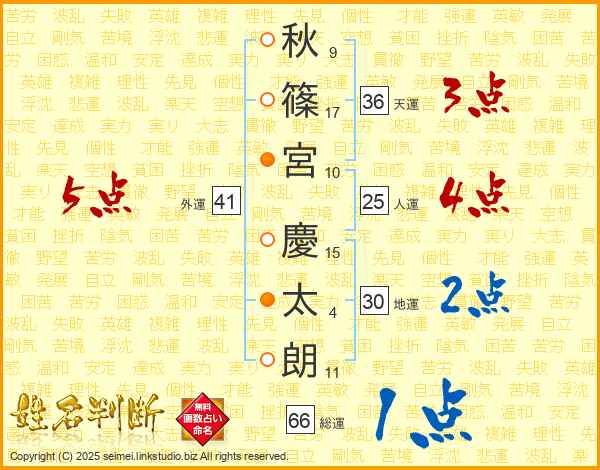 秋(9画)篠(17画)宮(10画) 慶(15画)太(4画)朗(11画)