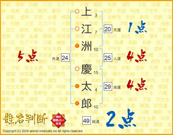 上(3画)江(7画)洲(10画) 慶(15画)太(4画)郎(10画)