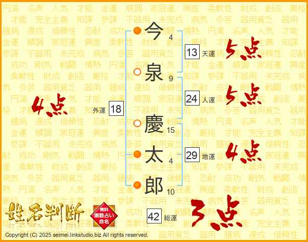 今(4画)泉(9画) 慶(15画)太(4画)郎(10画)
