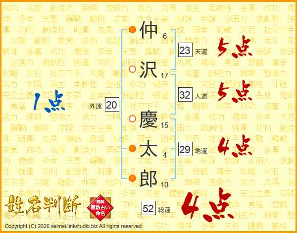 仲(6画)沢(17画) 慶(15画)太(4画)郎(10画)