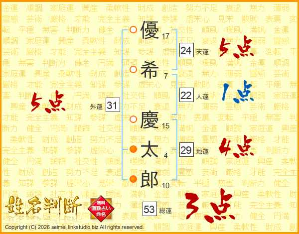 優(17画)希(7画) 慶(15画)太(4画)郎(10画)