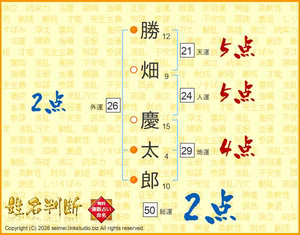 勝(12画)畑(9画) 慶(15画)太(4画)郎(10画)