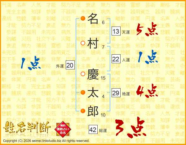 名(6画)村(7画) 慶(15画)太(4画)郎(10画)