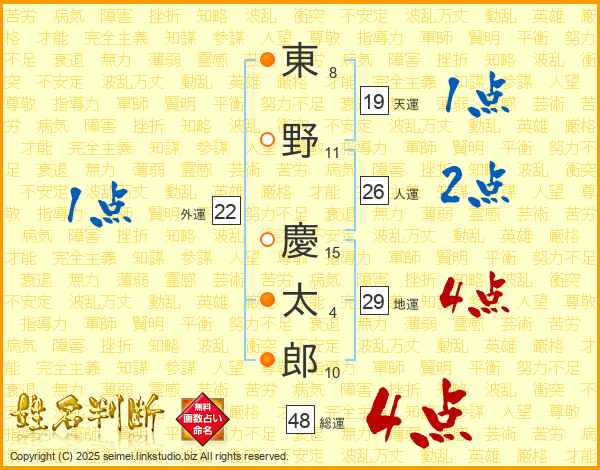 東(8画)野(11画) 慶(15画)太(4画)郎(10画)