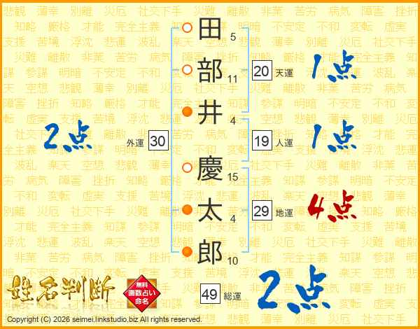 田(5画)部(11画)井(4画) 慶(15画)太(4画)郎(10画)