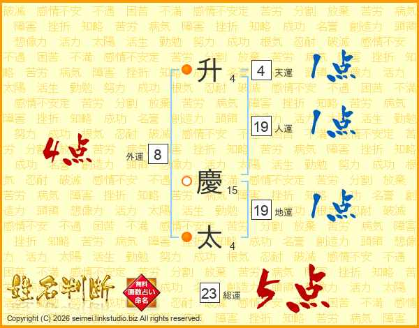 生活面を象徴する運勢です。外部から受ける影響力を表し、結婚運、家庭運や職場、環境への順応性を表します。総運から人運を引いた画数。姓や名が1文字の場合を除く。