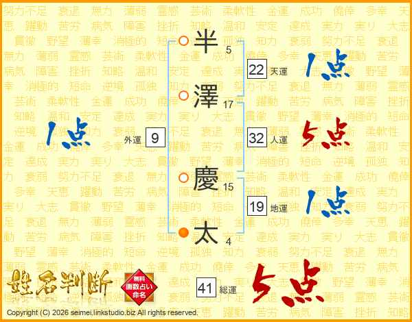 生活面を象徴する運勢です。外部から受ける影響力を表し、結婚運、家庭運や職場、環境への順応性を表します。総運から人運を引いた画数。姓や名が1文字の場合を除く。