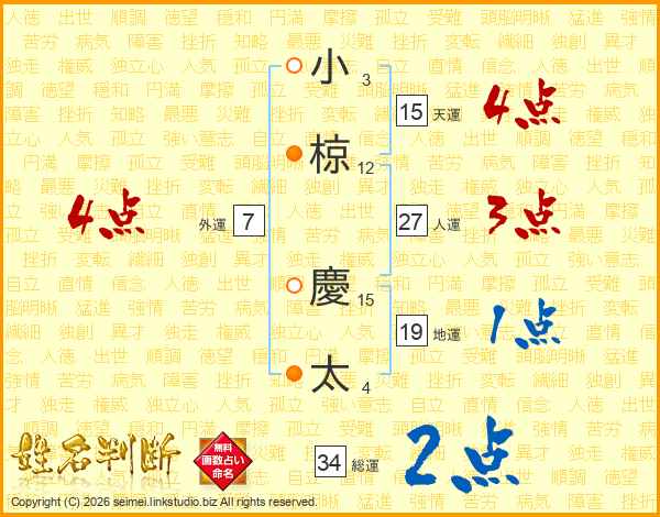 小(3画)椋(12画) 慶(15画)太(4画)