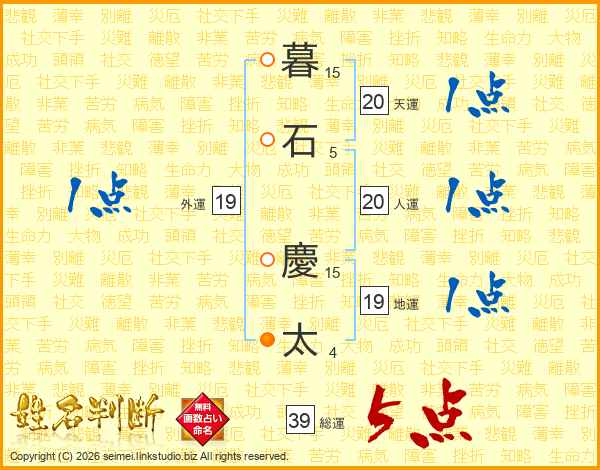 生活面を象徴する運勢です。外部から受ける影響力を表し、結婚運、家庭運や職場、環境への順応性を表します。総運から人運を引いた画数。姓や名が1文字の場合を除く。