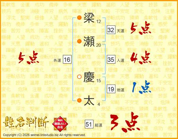 梁(12画)瀬(20画) 慶(15画)太(4画)